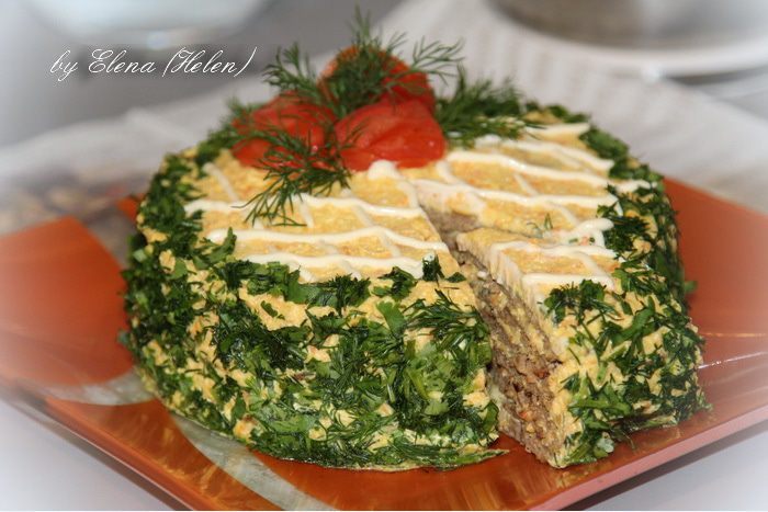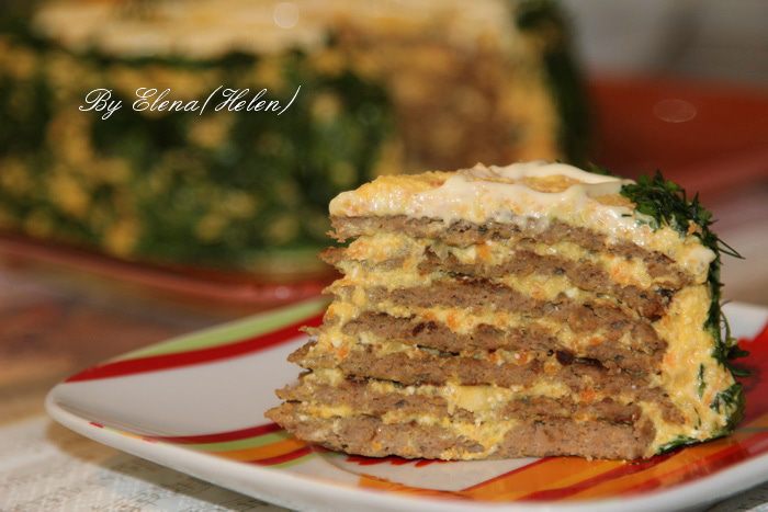 Наверное каждый из нас хоть раз в жизни делал печёночные оладушки. А если испечь блинчики и оформить как тортик, то получится замечательное праздничное блюдо! В данном рецепте я использовала творожно-овощной "крем". Но он может быть любым на ваш вкус, равно как и украшение! С наступающим праздником!