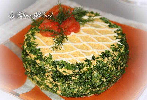 Далее собираем тортик: Каждый блинчик промазываем кремом и укладываем друг на друга. Затем кремом обмазываем и бока нашего тортика. Украшаем по желанию. У меня зелень и помидорные розочки.