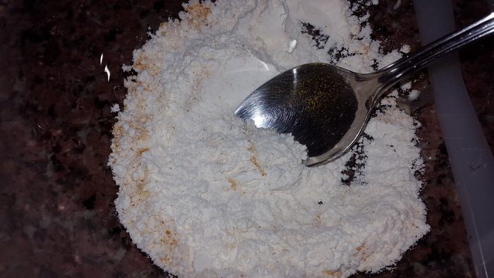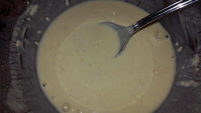 Готовим заправку-кляр. Муку смешиваем с солью и 0,5 ч.л. куркумы, перемешиваем и постепенно добавляем воду, доводя до консистенции блинного теста.