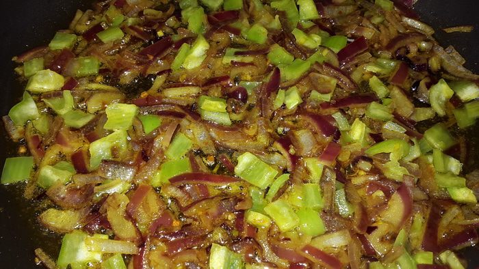 Когда лук станет мягким добавляем к нему перец, перемешиваем и убавляем огонь, тушим несколько минут. Затем кабачок, тоже перемешиваем и тушим несколько минут. И так последовательно все овощи.