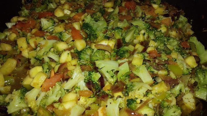 Помидор чистим и режем на кубики, брокколи откидываем на дуршлаг, обдаем холодной водой и тоже режем. Когда все овощи оказались в сковороде, солим, перчим, перемешиваем, тушим ещё несколько минут и выключаем огонь.