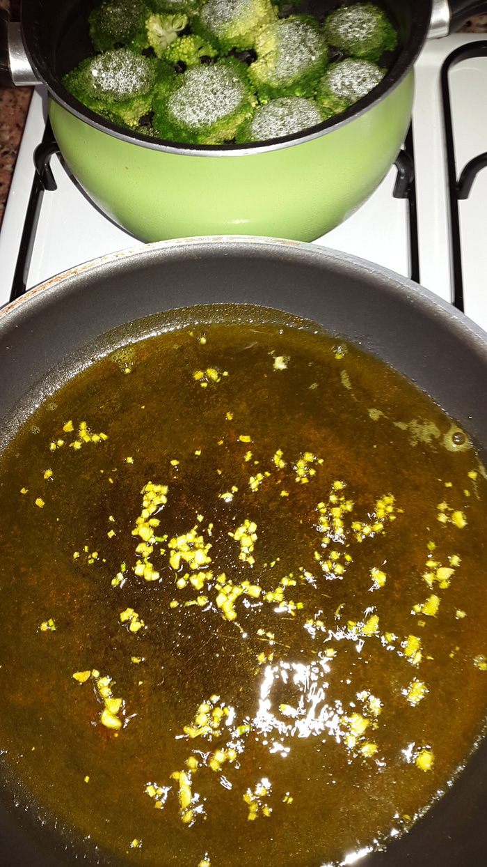Глиняные тарелки замачиваем на 15 минут в холодной воде. Небольшой кочан брокколи разбираем на соцветия и бланшируем в подсоленой воде 5-7 минут. В сковороду наливаем оливковое масло, добавляем 0,5 ч.л. куркумы, перемешиваем, через пару минут добавляем мелко нарубленный чеснок. Обжариваем еще пару минут. Лук режем на четверть кольца и добавляем к чесноку, обжариваем до мягкости.