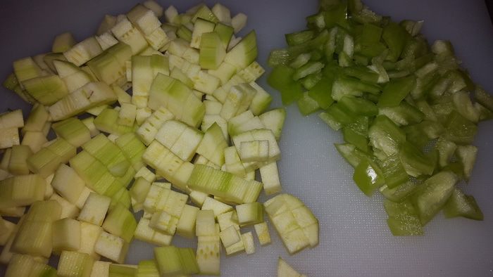 Кабачок и перец моем и режем на небольшие кубики. Если у кабачка кожица тонкая, то можно его не чистить.