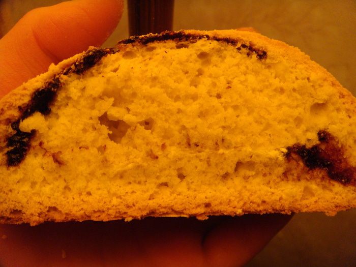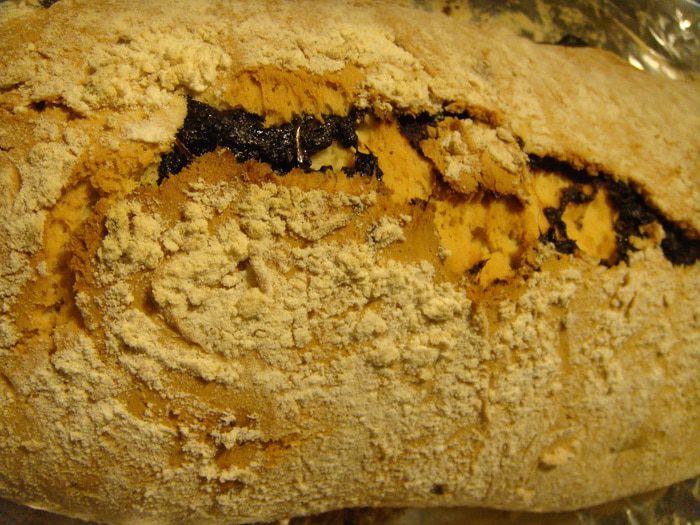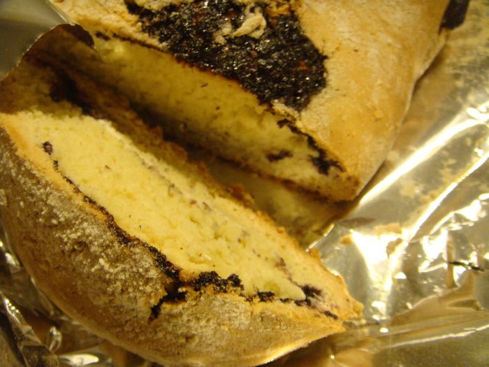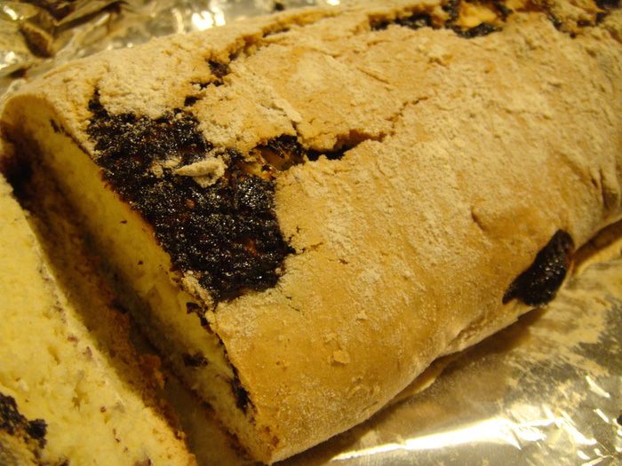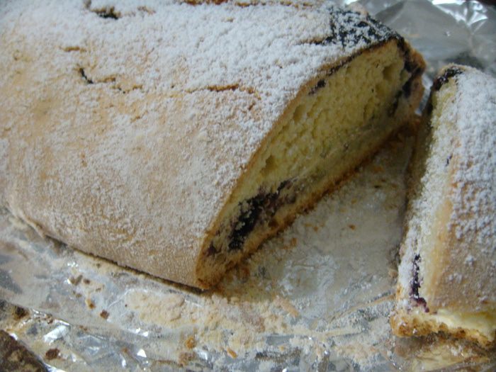 Начинка: для начинки я взяла протертую черную смородину с сахаром. У меня сахара немного. В смородину добавить 1 ст. ложку сухого (не размоченного!) желатина и выложить на тесто. Я выложила с одного края и с другого и свернула рулет по типу штоллена. Сначала один край на себя, потом тот, что ближе к вам-внутрь. И далее один на другой. Руками чуть-чуть его с длинных сторон подсобрать, получится длинный брусок.