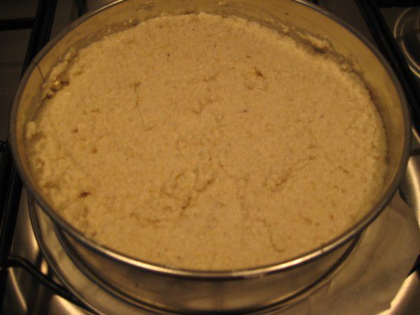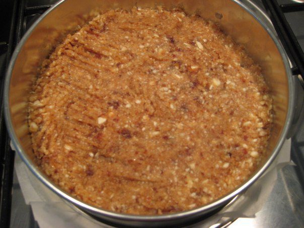 В блендере пробить миндаль с финиками и маленькой щепоткой морской соли. Распределить массу на дне формы d=18 см.