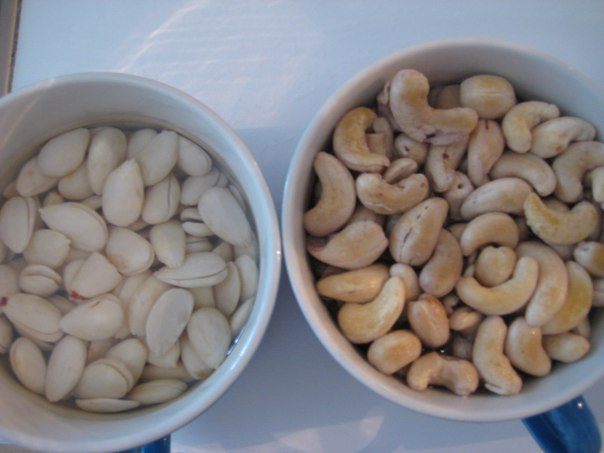 Очищенный миндаль и не жареный кешью замочить в холодной воде на 4 часа, я замачивала на ночь в холодильнике.