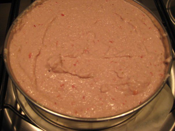 Во вторую половину добавить клубничное пюре, пробить блендером. Распределить клубничный слой. Убрать в морозильную камеру на 2 часа.
