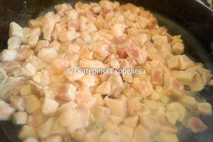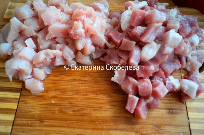 Куриное и свиное филе нарезать кубиком среднего размер, примерно 1х1 см.