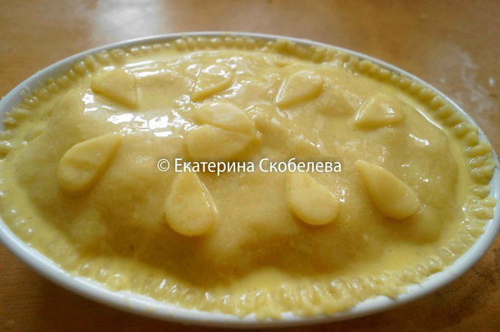 Из остатков теста вырезать фигурки и украсить по своему усмотрению верх пирога. Яйцо немного взбить со сливками и смазать верх пирога. Запекать пирог в разогретой до 180 градусов духовку около 40 минут.
