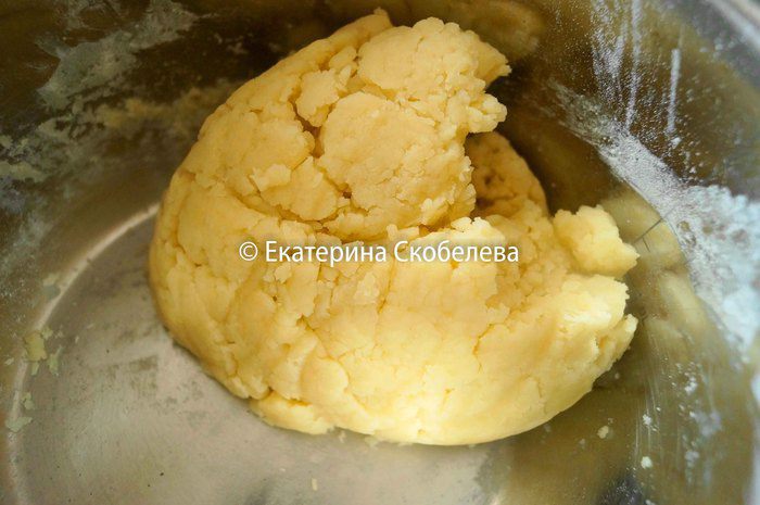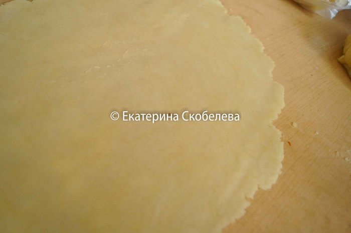 Остывшее тесто разделить на 2 части, одну побольше и другую поменьше. Большую часть раскатать в пласт толщиной около 3 мм.