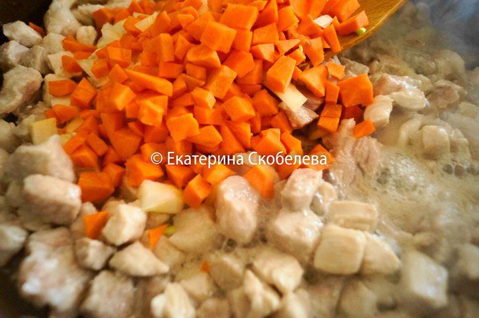 Добавить морковь, лук и тушить на медленном огне минуть 10.
