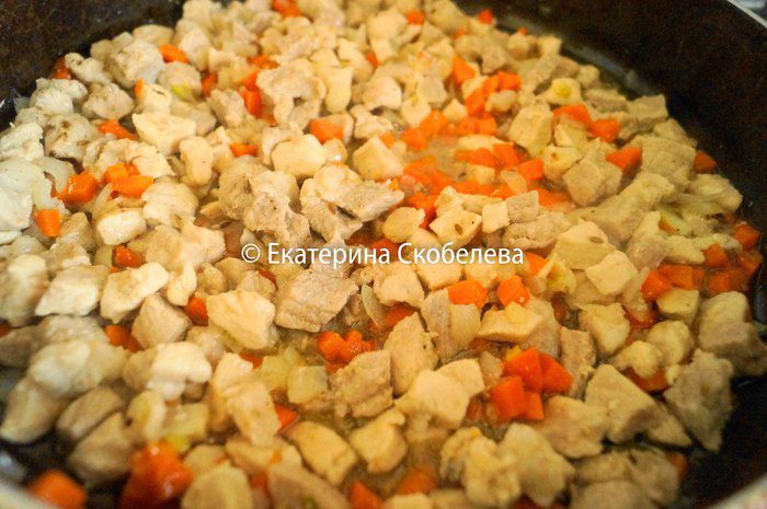 В сковороде на растительном масле обжарить, но не зажаривая сильно мясо.