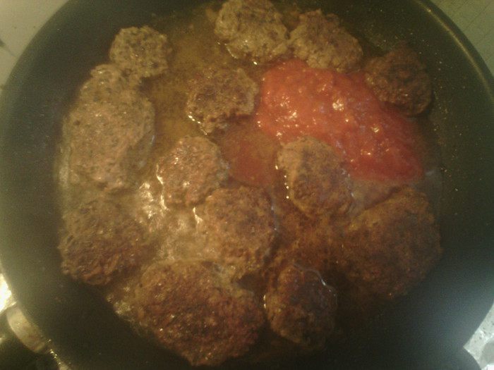 Добавить немного воды, томатный соус и готовить ещё пару минут.