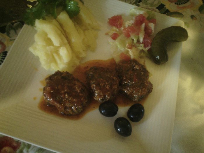 Слить воду из картофеля, посолить, добавить сливочное масло, раздавить вилкой (или просто посыпать зеленью.) Подавать с котлетами и соусом.
