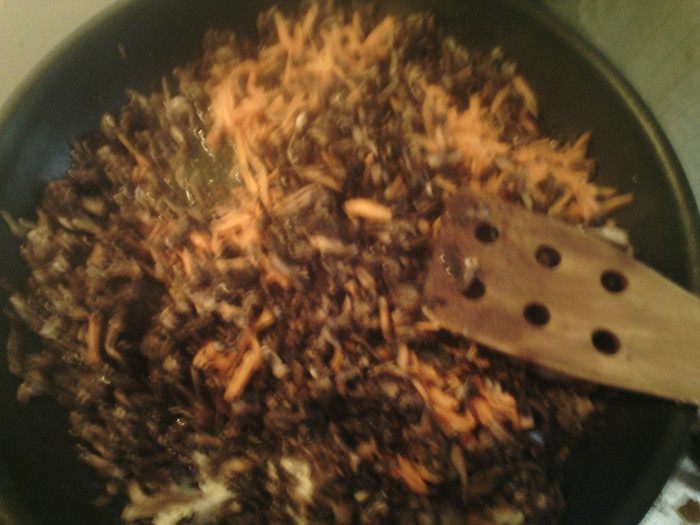 В сковороду налить оливковое масло и положить шампиньоны и морковь, посолить, добавить специи, накрыть крышкой и готовить 5 минут на сильном огне. Шампиньоны выпустят воду, снять крышку добавить тертый чеснок и готовить на медленном огне 10 минут.