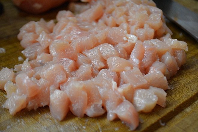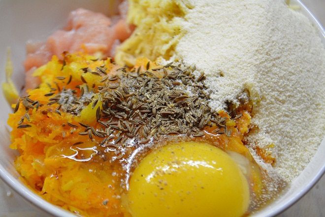 Смешать в миске куриное филе, лук с морковью, картофель, 2 ст.л манки с горой, яйцо, соль, перец и тмин. Вымесить фарш.