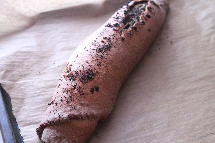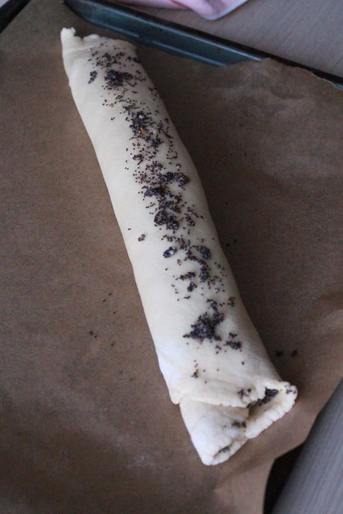 Подготовить целлофановый пакет или силиконовый коврик, присыпать мукой и раскатать тесто в прямоугольный пласт 1 см толщиной. На тесто выложить начинку из мака (1 чайную ложку маковой начинки оставить для присыпки) и свернуть длинным рулетом. Выложить на пергамент, сверху присыпать маковой начинкой.