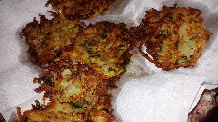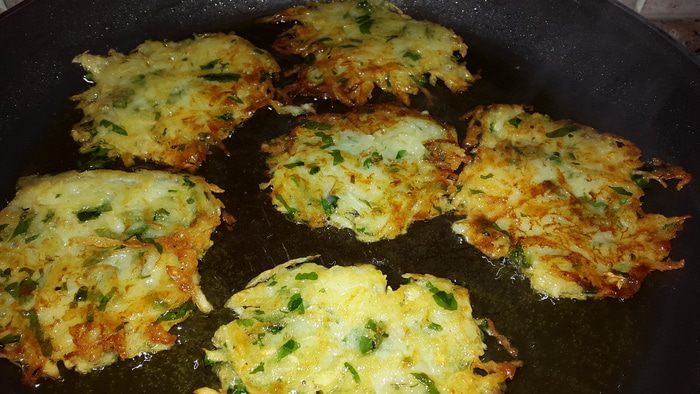 Разогреваем в сковороде оливковое масло и выкладываем нашу смесь с помощью столовой ложки, разравнивая и придавая форму оладушек. Обжариваем до золотистой корочки с двух сторон.