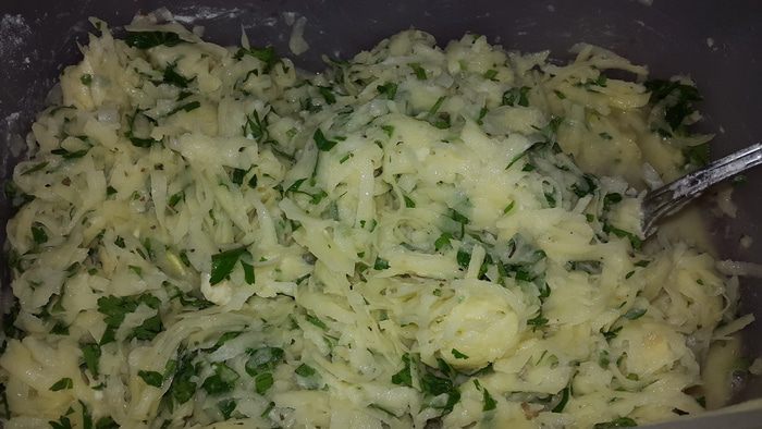 Картофель моем, чистим и натираем на крупной тёрке. Луковицу и чеснок натираем на мелкой тёрке. Солим, перчим, добавляем муку, сухие травы и рубленную петрушку, тщательно перемешиваем.