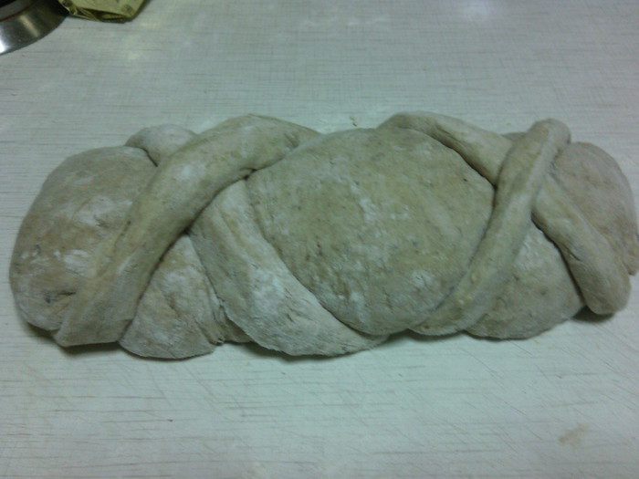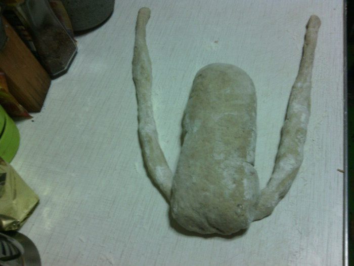 Из оставшегося светлого теста скатать 2 жгута и соединить их концами (или скатать один длинный и сложить пополам), прикрепить жгуты снизу на "торце" тёмного рулета.