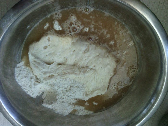 Просейте оба вида муки, добавьте отруби, соль, дрожжи, перемешайте. Добавьте опару и медовую водичку, замесите тесто.