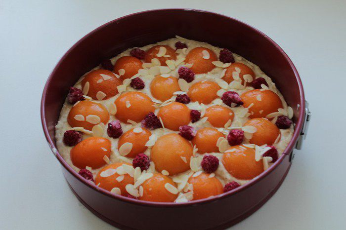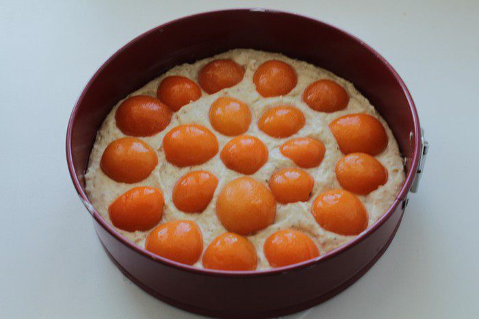 Разъёмную форму диаметром 24 см застелить пекарской бумагой, смазать маслом. Выложить тесто в форму. Сверху выложить половинки абрикосов на тесто.