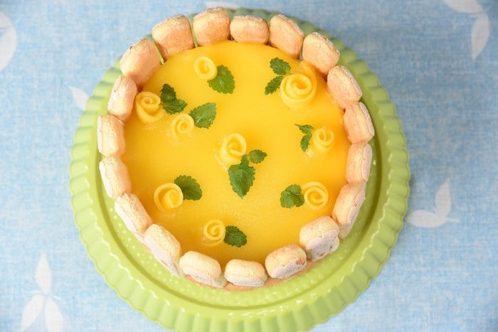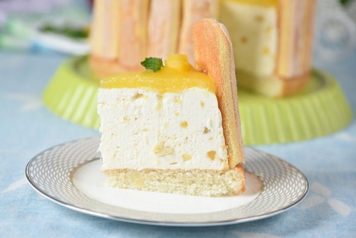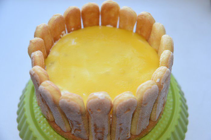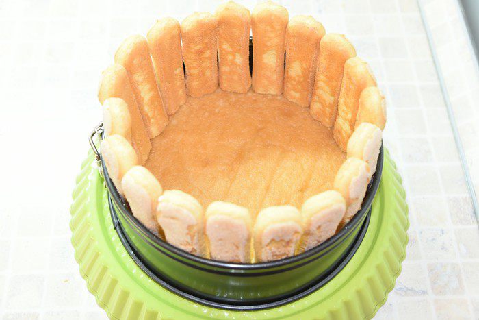 Если мусс получился жидковатым, то его надо сначала охладить немного, чтобы он слегка загустел, а потом выливать в форму, иначе савоярди сильно размокнет. У меня мусс был нормальной густоты, так что я сразу залила его в форму.