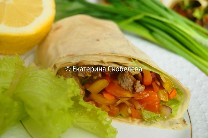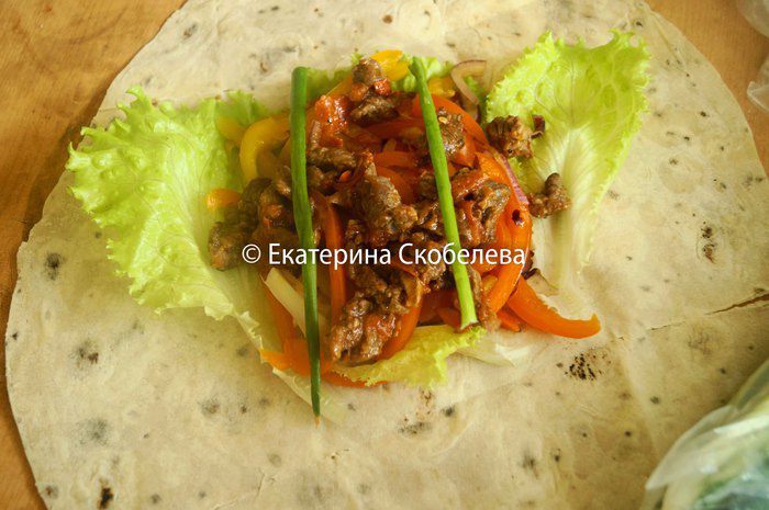 Лаваш развернуть, положить на него листья салата, затем часть маринованных овощей, сверху уложить говядину и зеленый лук. Завернуть лаваш, подогнув верхний и нижний края к начинке и свернув рулетом.