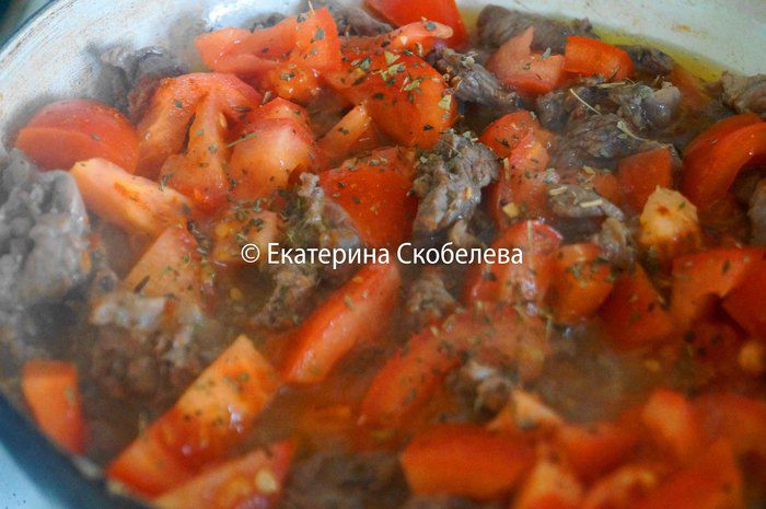 Добавить к ней нарезанный кубиками помидор и тушить, примерно 15 минут. до того пока основная часть влаги не выпарится. В конце добавить красный молотый перец, зиру, базилик и орегано. Тушить пару минут, снять с огня, дать немного остыть.