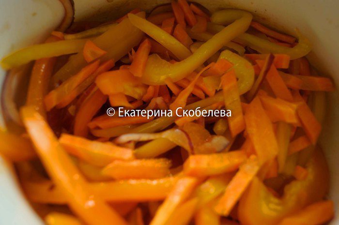Лук нарезать тонкими полукольцами. Болгарский перец и морковь - соломкой. Поместить их в одну глубокую чашу, посолить, добавить сахар, сбрызнуть бальзамическим уксусом и оставить мариноваться на 2 часа.