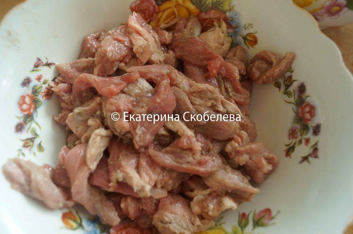 Телятину промыть и нарезать тонкими полосками. Сложить в глубокую чашу, посолить, добавить черный молотый перец, перемешать и залить лимонным соком. Снова перемешать и оставить в сторонке мариноваться на 2 часа.
