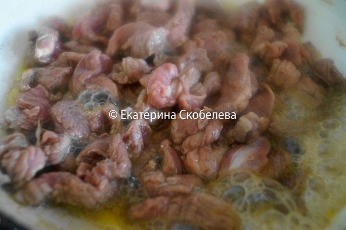 Говядину обжарить на оливковом масле около 5 минут, не давая ей зажариться.