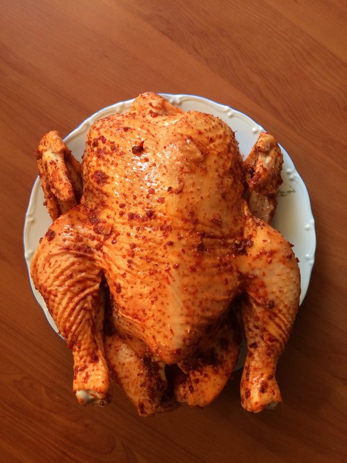 Пока дрова превращаются в угли, подготавливаем фазана - моем, сушим и щедро, не торопясь натираем его аджикой. Перец и соль использовать не стоит, так как аджика острая и достаточно соленая, а излишняя соль не позволит мясу фазана остаться сочным и нежным.