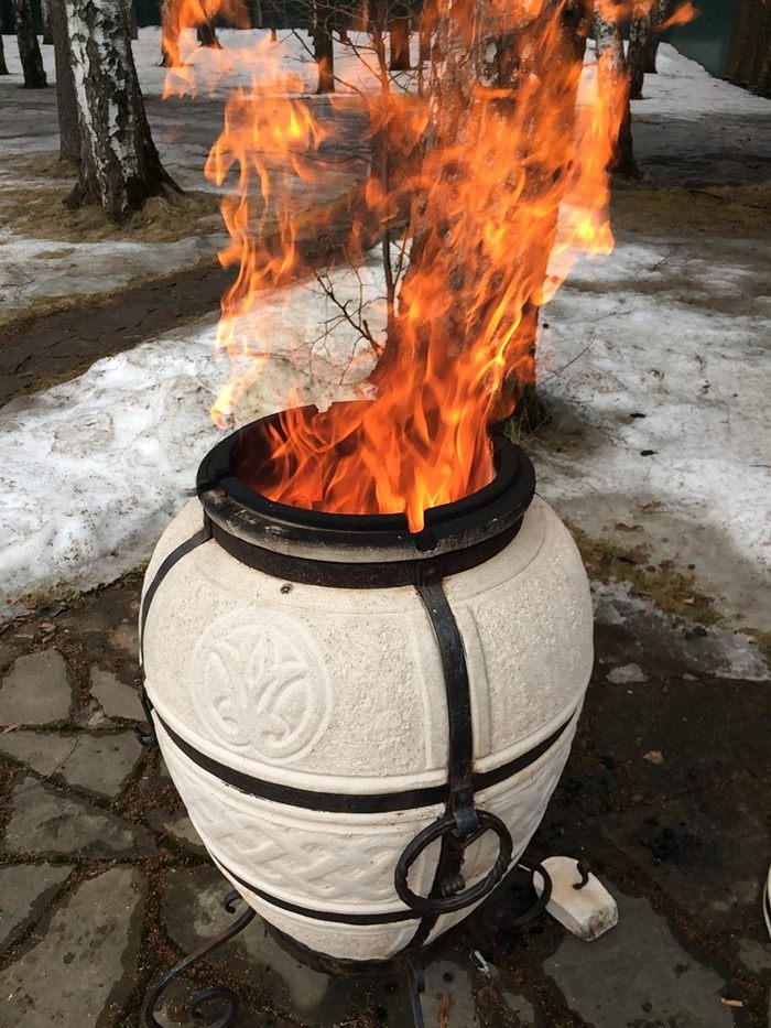 Начинаем растапливать тандыр. Дрова березовые кладем по горлышко.