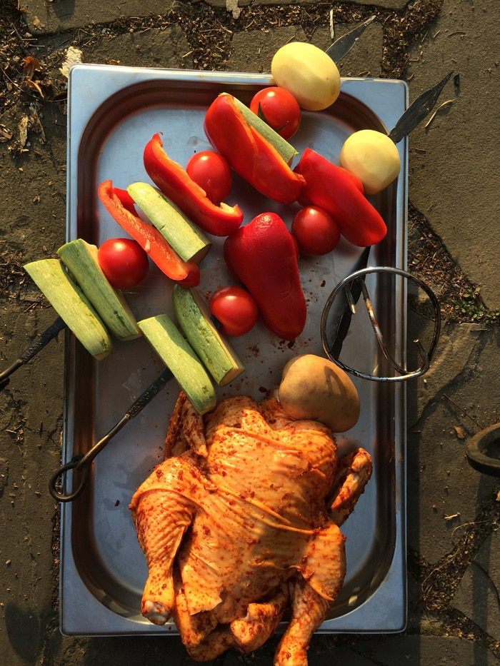 По прошествии времени поднимаем крышку тандыра и достаем шампуры с фазаном и овощами. Раскладываем на блюдо и начинаем пробовать, что у нас получилось.