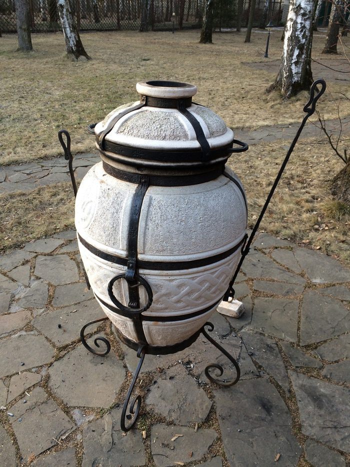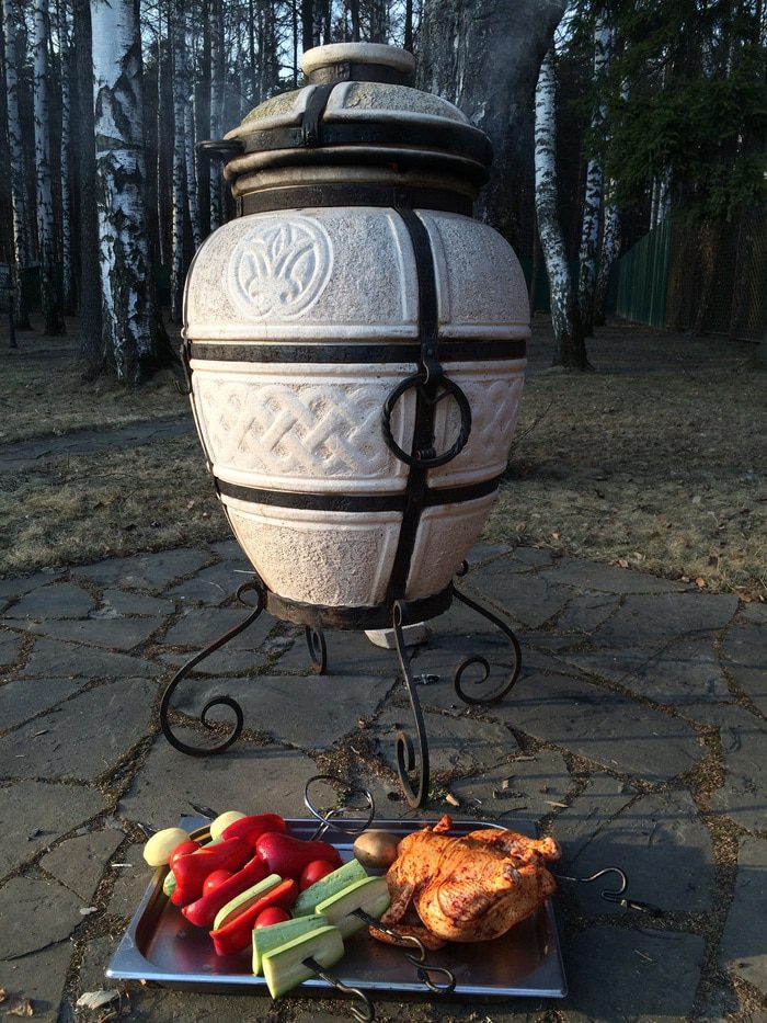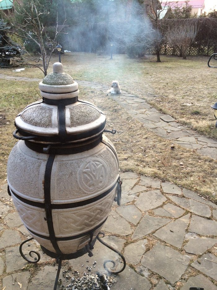 Дрова в тандыре прогорели и он стал внутри белым. Помещаем наши заготовки на специальном кольце в тандыр, закрываем его крышкой и ставим таймер на 50 мин.