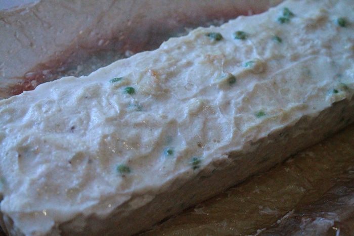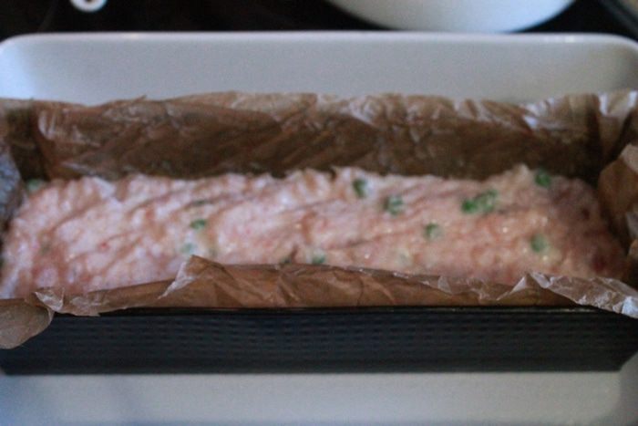 Подготовьте удлиненную форму, например как для кекса, положите в нее промасленный пергамент, поставьте форму в противень и наполните его наполовину водой. Фарш выложите в подготовленную форму.