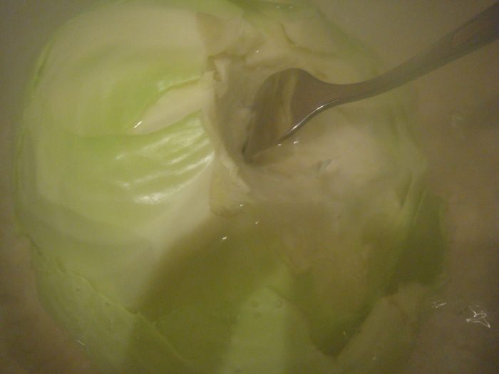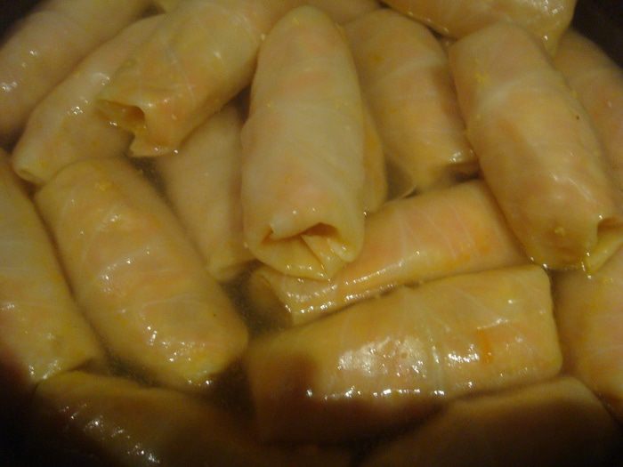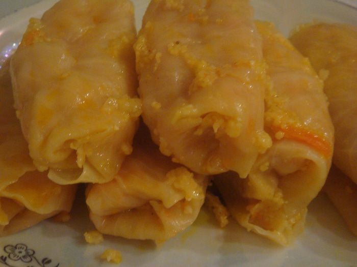 Кукурузную крупу залейте кипятком, и сварите до готовности на слабом огне (для голубцов лучше брать кукурузную крупу грубого помола). Морковь натрите на крупной терке, лук нарежьте мелкими кубиками. Разогрейте масло в сковороде, поджарьте на нем до золотистости лук и морковь. тушеные овощи переложите в глубокую миску и соедините с кукурузной крупой. Перемешайте, посолите, поперчите и добавьте немного мускатного ореха.