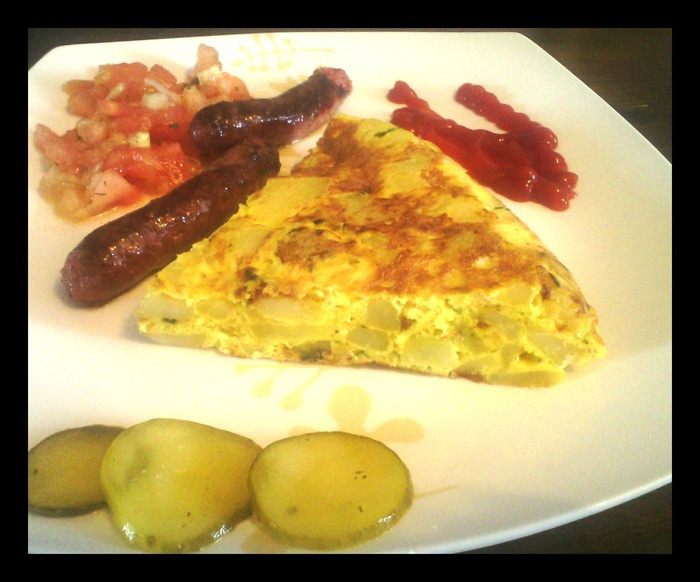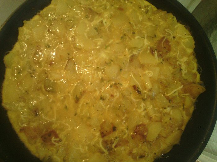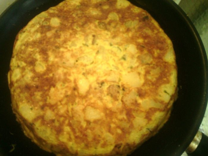 Накройте крышкой, поднимите сковороду и быстро переверните. Тортилья останется на крышке, осторожно верните ее на сковороду (дайте ей аккуратно сползти).
