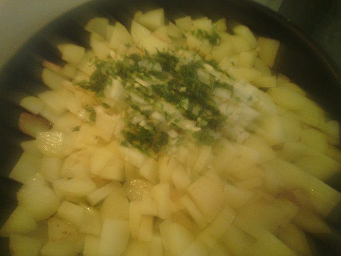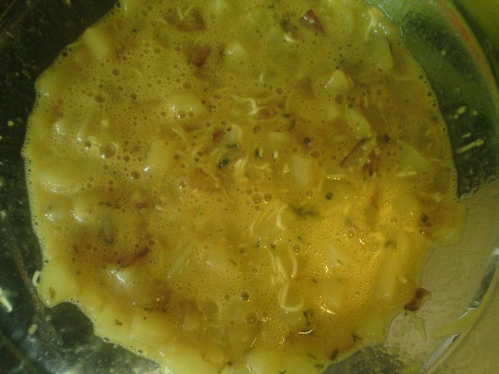 Выложить на сковороду, выровнять, накрыть крышкой и довести до состояния похожее на застывшее желе. Готовим 10-15 на медленном огне.