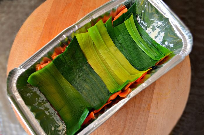 Форму выстелить бумагой для запекания (или же, как у меня, использовать алюминиевую форму). Смазать форму сливочным маслом. Чередуя, выложить на дно формы морковь и лук-порей.