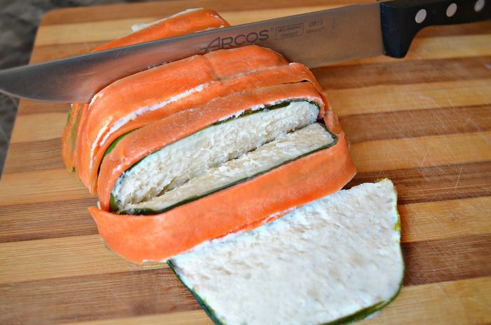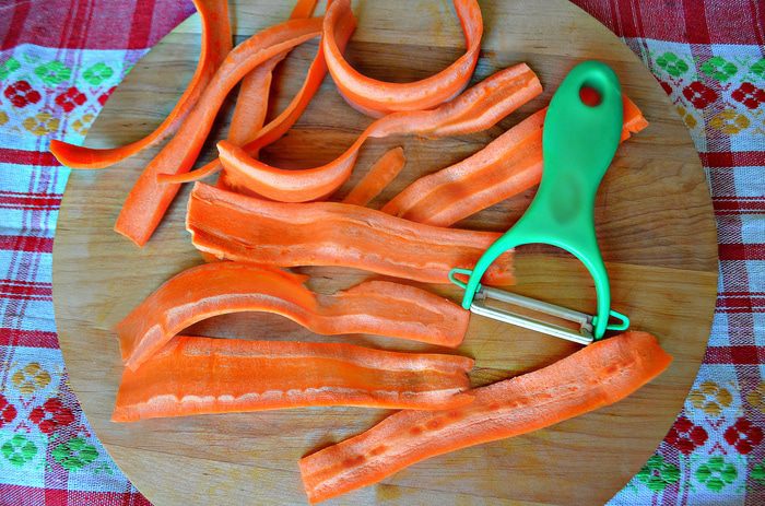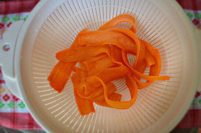 Очистить морковь и с помощью овощечистки нарезать тонкими лентами. Уложить морковь в миску и залить кипятком на 1-2 минуты.