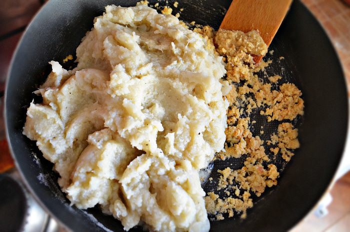 Выложить в сковороду пюре из капусты и перемешать.