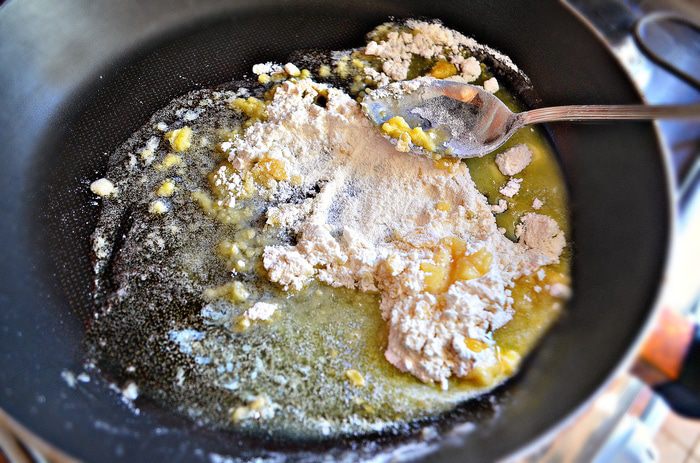 В сковороде растопить сливочное масло, всыпать муку. Обжарить до карамельного цвета и орехового аромата (2-3 минуты).