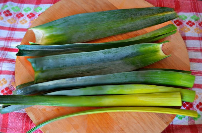 Срезать с лука-порея зелёную часть и также залить кипятком на 1-2 минуты и затем, слив горячую воду, залить ледяной водой.