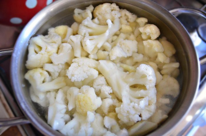 В кастрюле вскипятить и посолить воду. Соцветия цветной капусты проварить в течение 5 минут. Затем откинуть цветную капусту на дуршлаг. Измельчить блендером капусту до пюреобразного состояния, досолить по необходимости, поперчить.