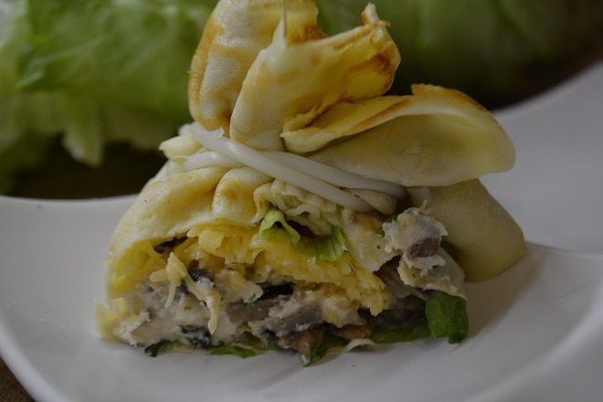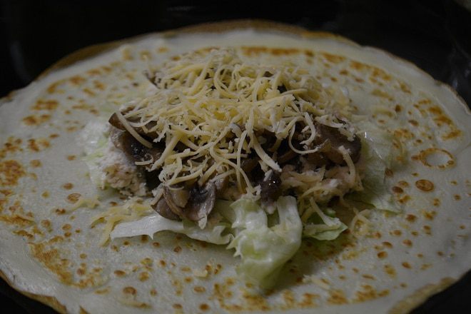Сборка: на середину готового блинчика уложить лист айсберга, куриную начинку, грибную начинку и посыпать сыром.