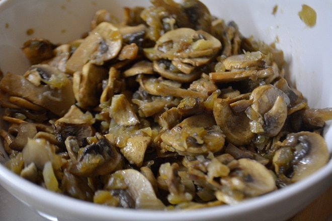 На сковороде с небольшим количеством постного масла обжарить репчатый лук, к нему добавить грибы и жарить 7-10 минут. Посолить и поперчить по вкусу.