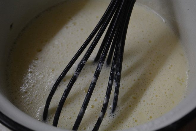 Теперь готовим тесто: смешать муку и крахмал. В другой посуде взбить яйца с молоком. Тонкой струйкой влить молочную смесь в муку, не переставая помешивать, чтобы не было комочков.