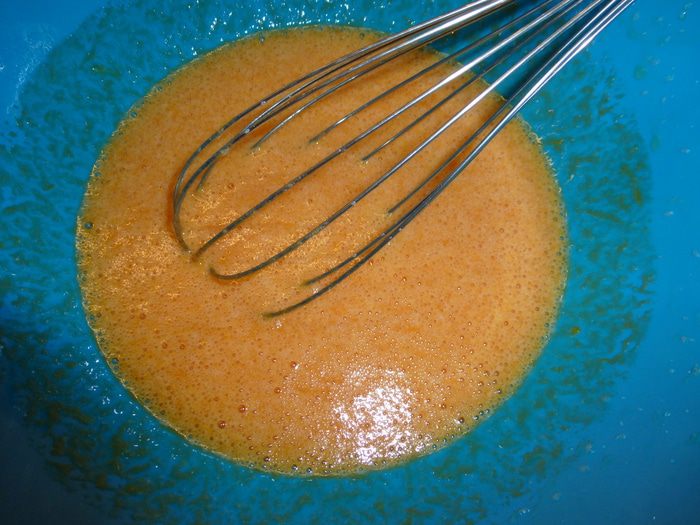 К тыквенному пюре добавляем яйца, соль и сахар, взбиваем венчиком до однородности.